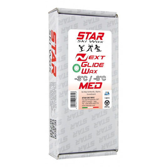 Star's NEXT wax line is the top of It's class! It's a full line containing everything you need for top-level, fluoro-free racing: liquids, blocks, powders, paraffins, and even a dirty snow spin-off line. The NEXT blocks are designed for top fluoro-free performance. The NEXT MED is best for -3°C to -8°C in all snow conditions. Star blocks are a speedy topper for cold apply application. Apply block directly on roto wool applicator, run along ski base for 2-3 passes, then finish with soft nylon. For each NEXT block you use, you should use a separated roto wool applicator. This stops cross-contamination between waxes which may have different additives which may work counter-productively to each other. Make sure to label each wool with which wax it was used with! Like all NEXT products, the paraffin has Star's ceramic technology for the best fluoro-free performance! Best pairs with NEXT bases. Comes in 28g blocks (actually 32g on a scale) in cardboard packaging for less plastic waste.